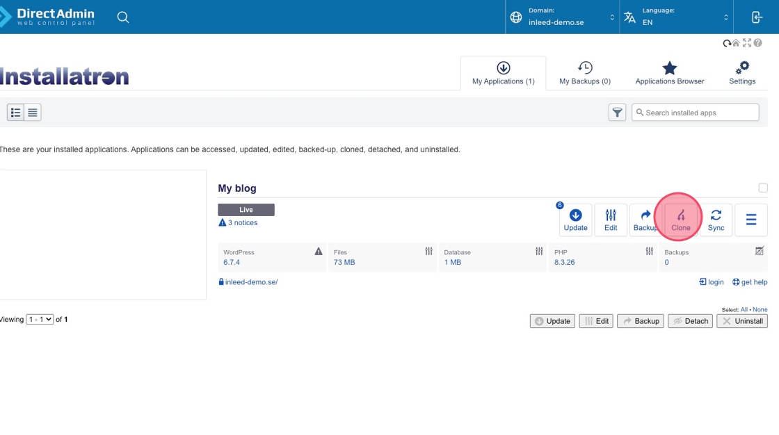 Klicka på "Klona" (Clone) vid den Wordpress-installation du vill skapa en staging-sida för.