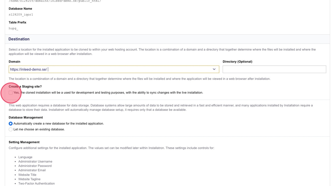 Kontrollera alltid att du väljer rätt domän och mapp för staging-sidan så att du inte skriver över din aktiva webbplats.