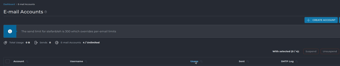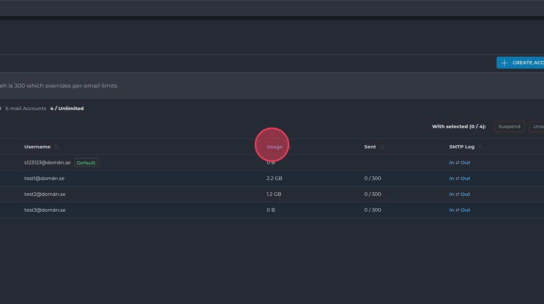 Klicka på "Usage" för att sortera e-postkonton efter diskutrymme.