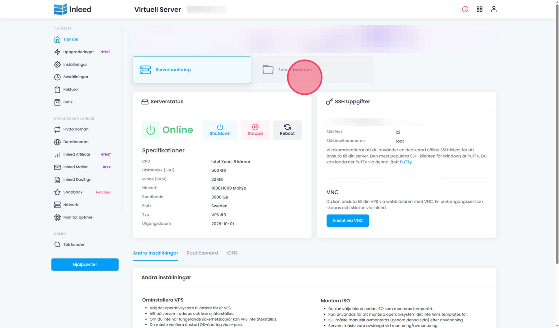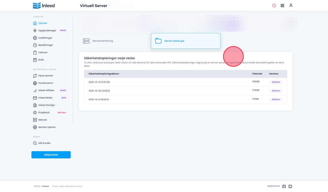 Den här guiden visar hur du återställer din VPS från en backup via kundzonen om du har en "managed" VPS-tjänst där backup ingår. Har ni inte managed så behöver ni sjävla ta backup.