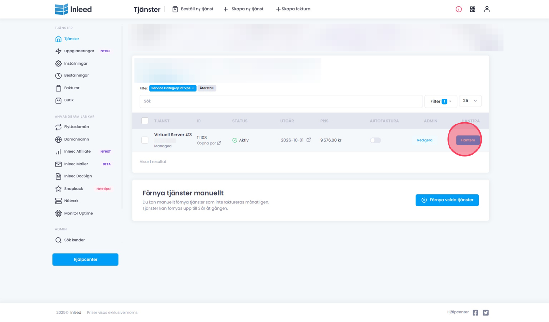 Klicka på "Hantera" på din VPS-tjänst.