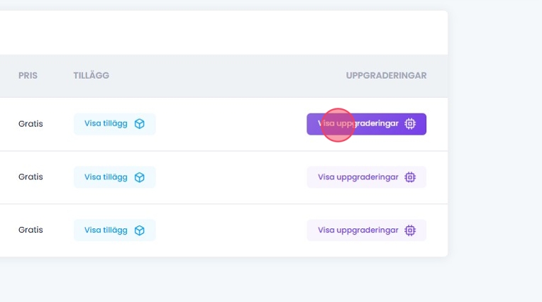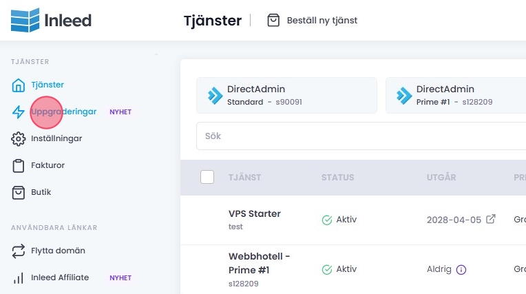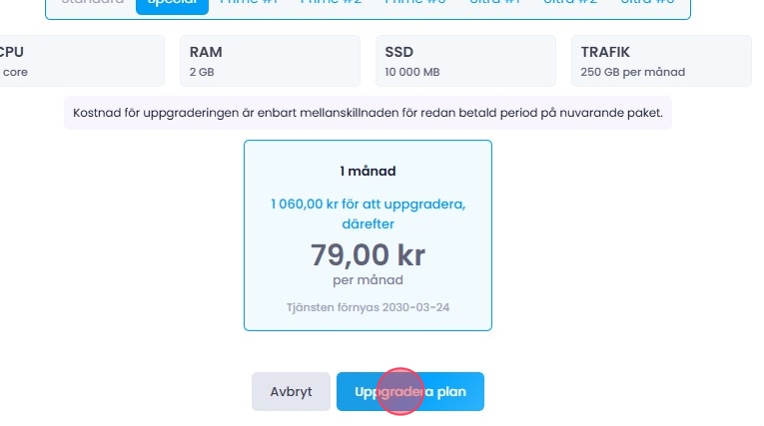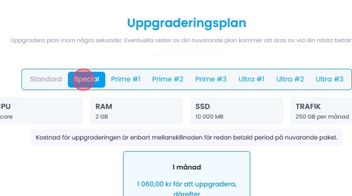 Välj önskad tjänst. I detta exempel uppgraderar vi från "Standard" till "Special". (Din aktuella tjänst är gråmarkerad)