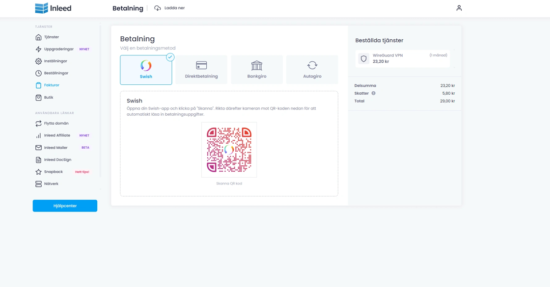 Välj önskad betalmetod. Tjänsten aktiveras först när betalningen är registrerad. Swish och kort ger snabbast aktivering, medan bankgiro kan ta 1–3 arbetsdagar.