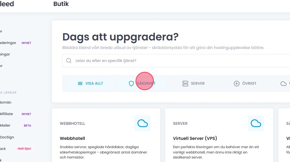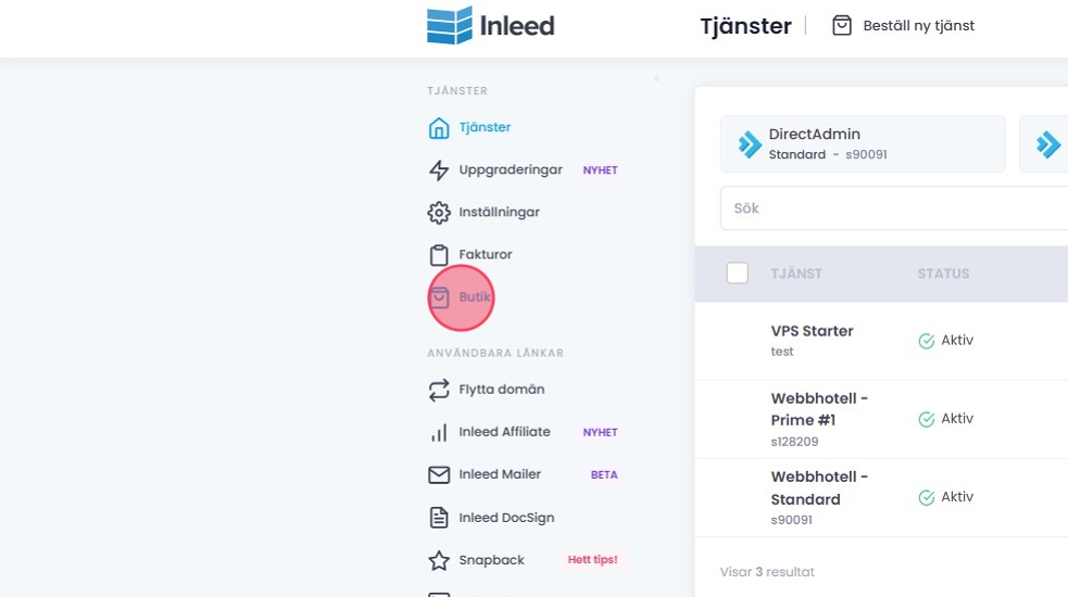 Klicka på "Butik" i menyn för att komma till översikten över tillgängliga tjänster.