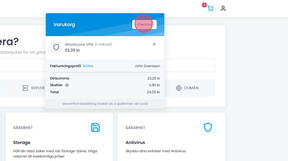 När du har lagt till alla önskade tjänster i kundvagnen, klicka på kundvagnsikonen och sedan på "Checkout" för att gå vidare till betalning.