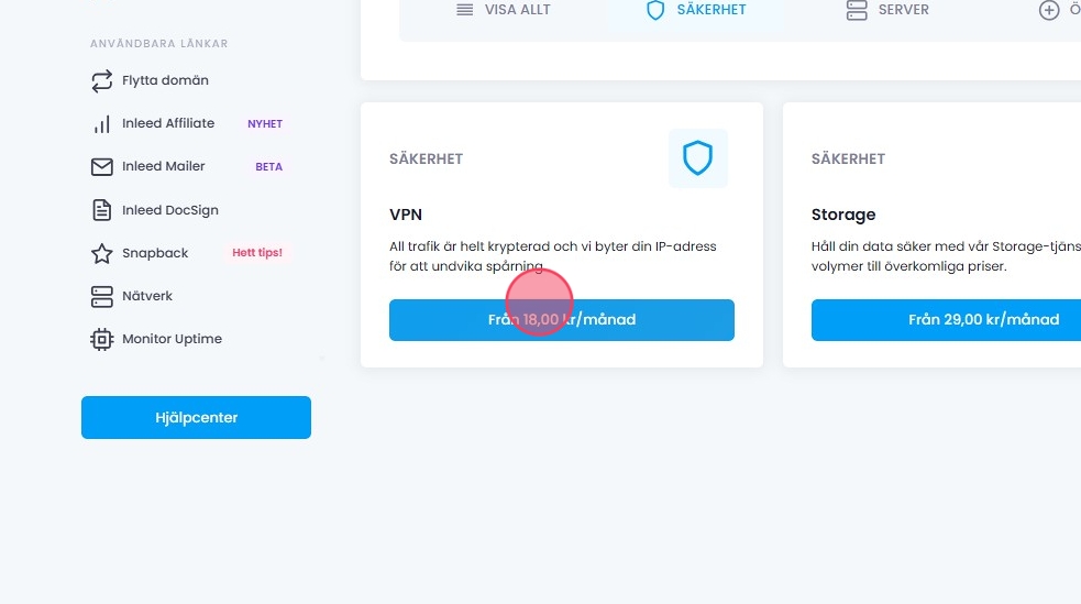 Här ser du alla tjänster som erbjuds. Använd kategorierna för att filtrera och hitta den tjänst du vill beställa. I exemplet väljer vi "VPN" under kategorin "Säkerhet".