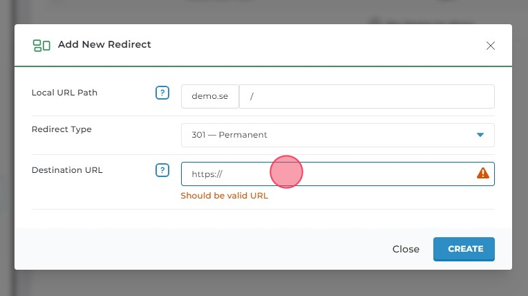 Destination URL: Här väljer du den nya adressen för vart din omdirigering ska leda besökaren. Om du skriver https://demo.com kommer besökaren att hamna på den adressen.