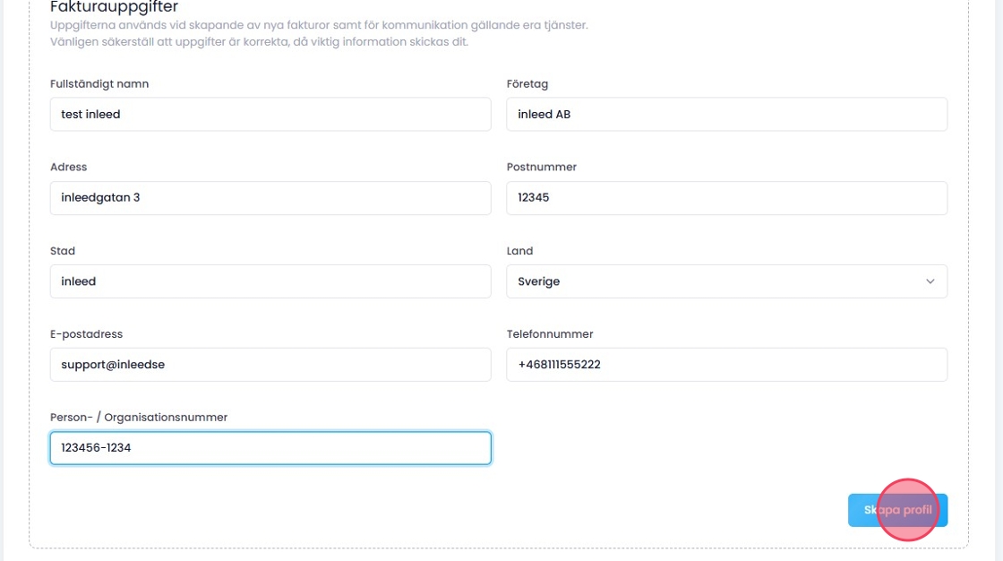 5Fyll i de nya adressuppgifterna och klicka på "Skapa profil" för att spara den nya fakturaprofilen.