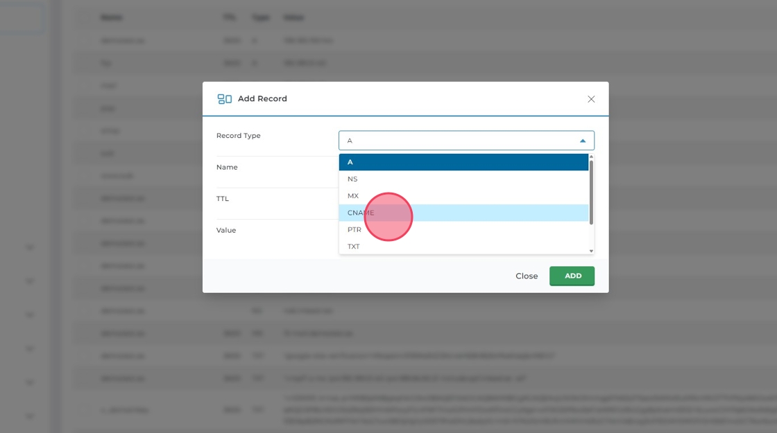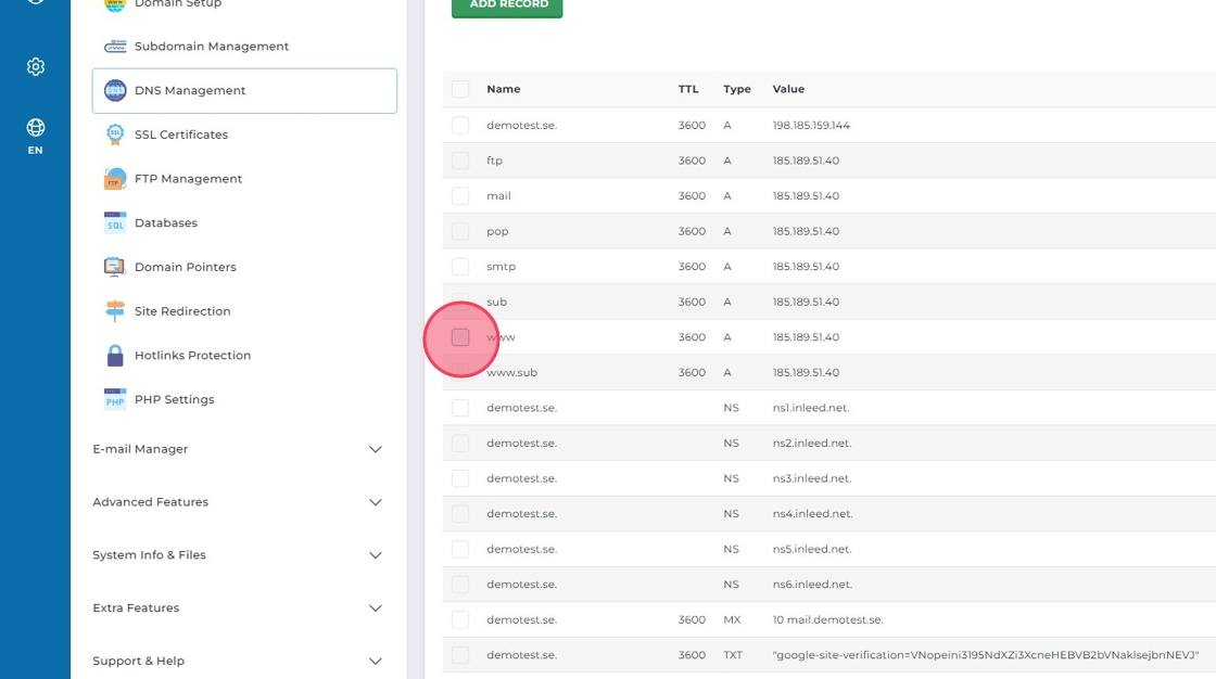 Klicka på "Add record" för att lägga till en ny post för www.