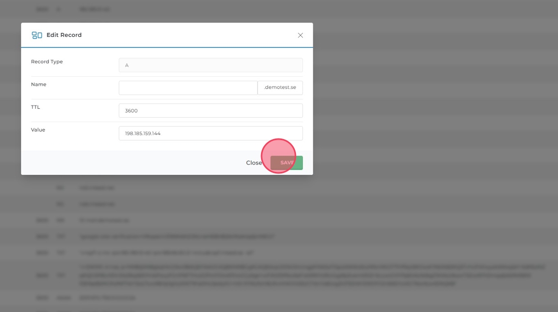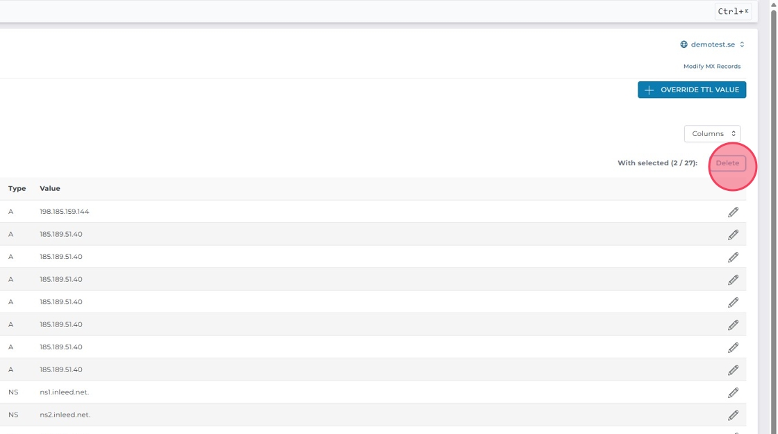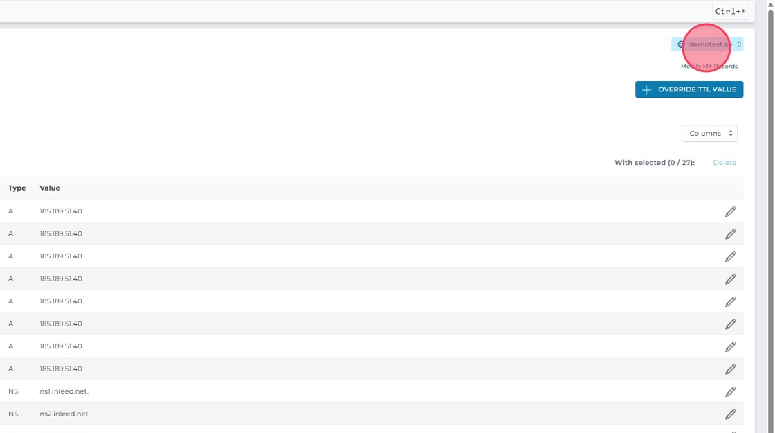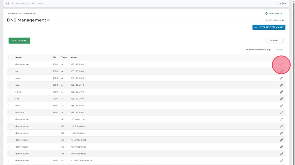 Klicka på pennan till höger om A-posten för din domän för att ändra IP-adressen.
