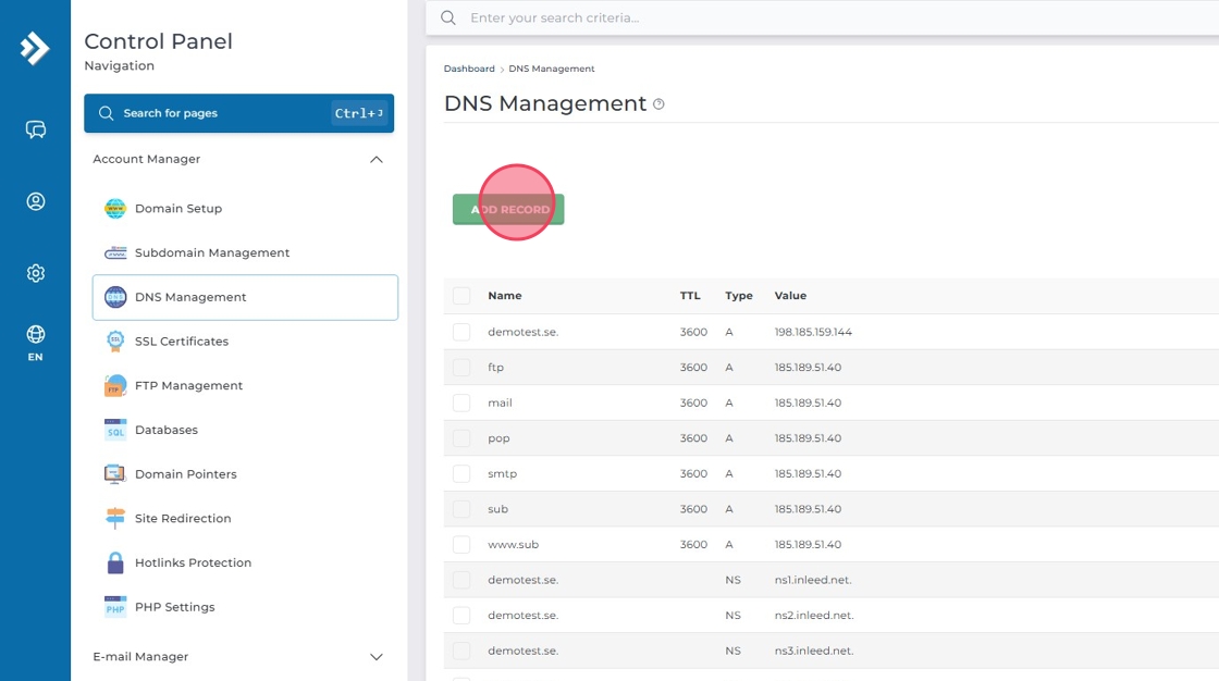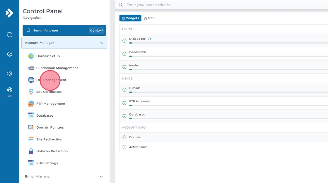 Klicka på "Account Manager" och välj sedan "DNS Management".