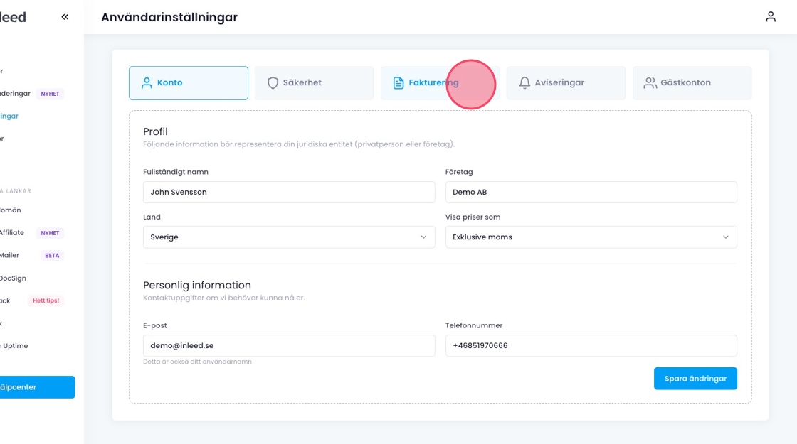 3Välj "Fakturering" för att komma till faktureringsinställningarna.