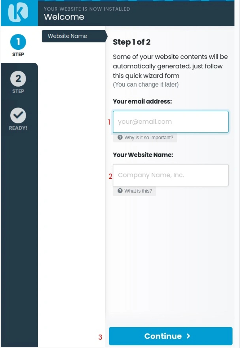 7Fyll i din e-postadress, ange namnet på hemsidan och klicka sedan på "Continue" för att slutföra installationen.