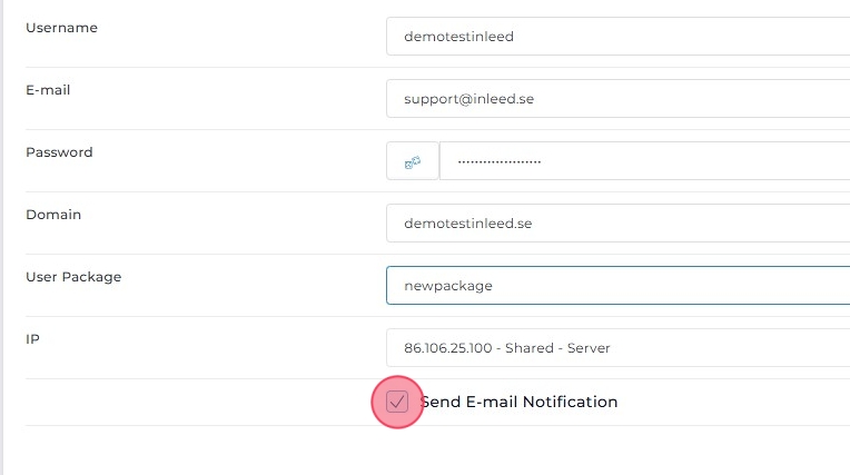 5Ange användarnamn, e-postadress, lösenord, domän, användarpaket och välj IP-adress om flera finns tillgängliga.