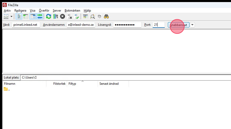 Fyll i lösenord och port (21 för FTP). Klicka sedan på "Snabbanslut".