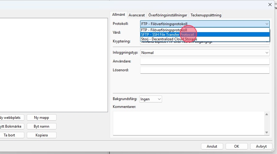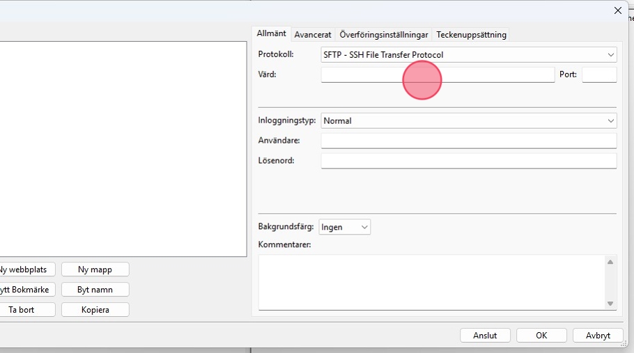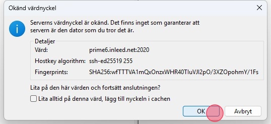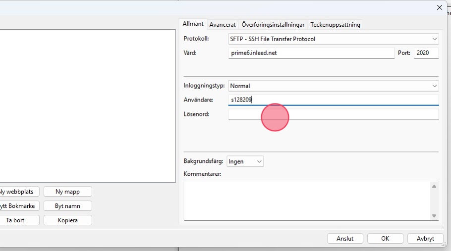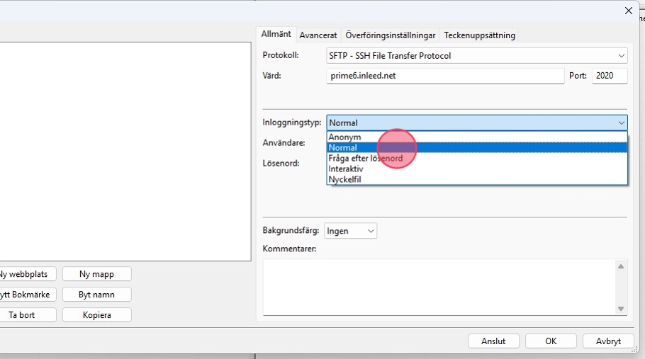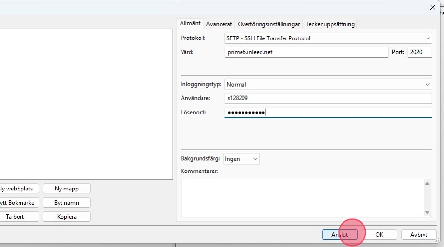 Ange värdnamn (serveradress till ditt webbhotellskonto) och port: 2020