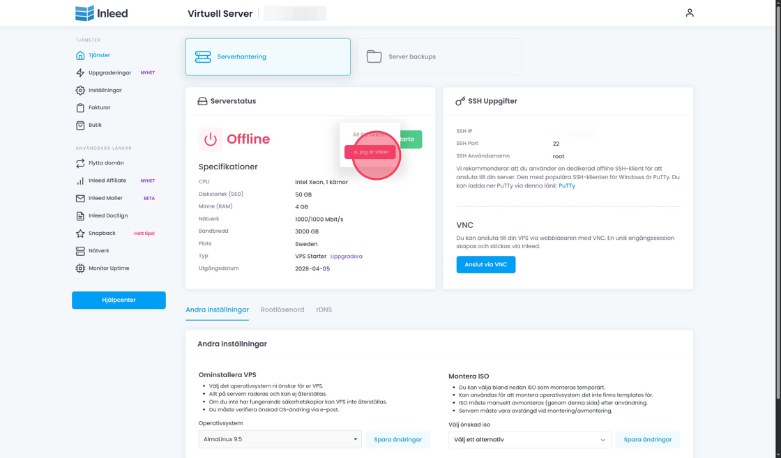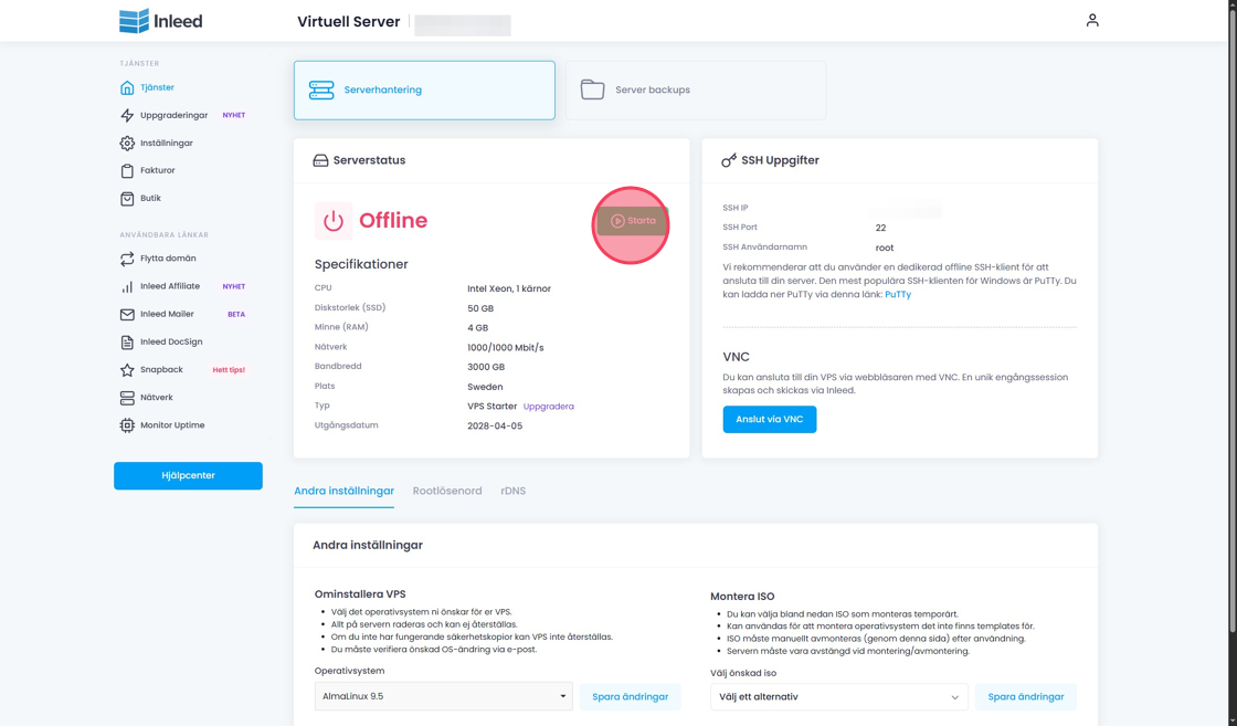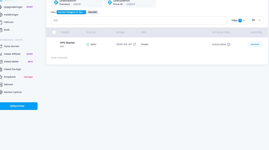 Denna guide visar hur du startar en VPS-tjänst via Inleeds kundzon.
