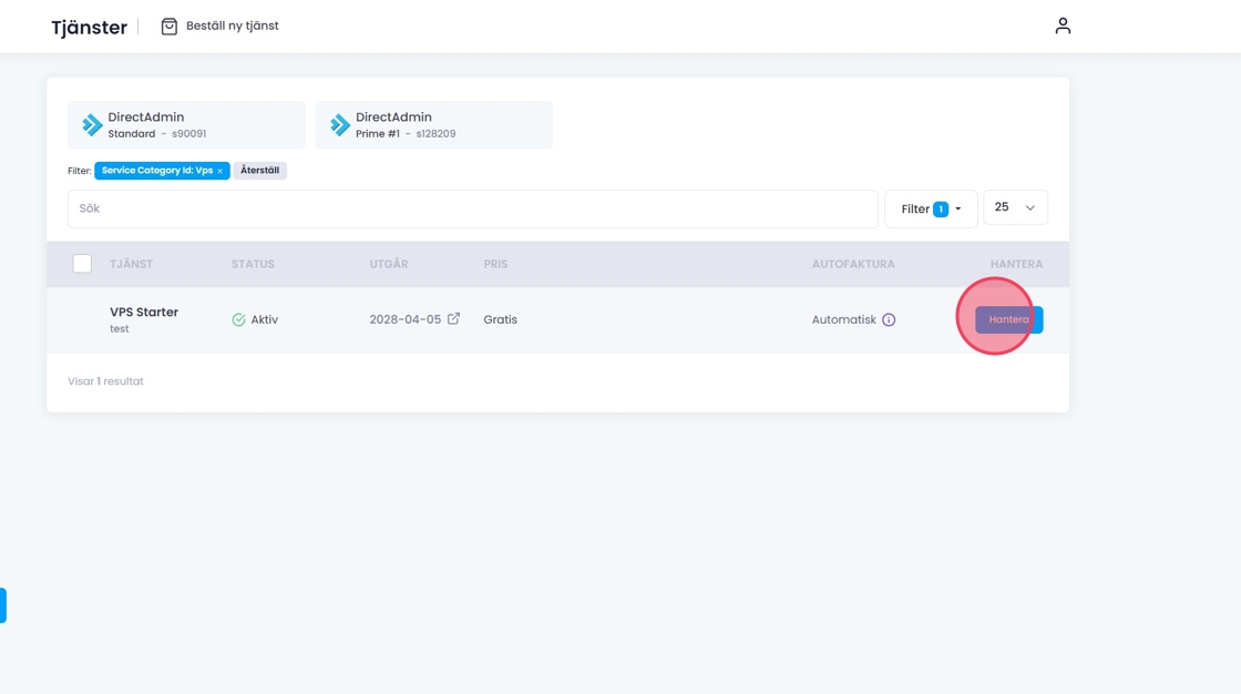Klicka på "Hantera" vid den VPS-tjänst du vill starta.