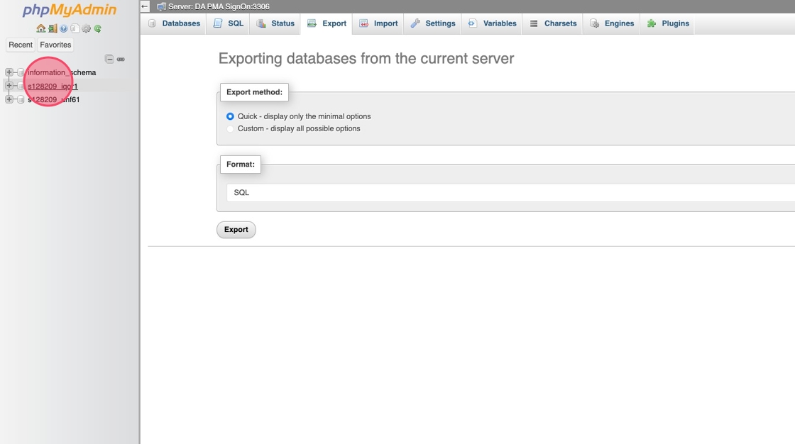 5Välj den databas du vill exportera i vänstermenyn.