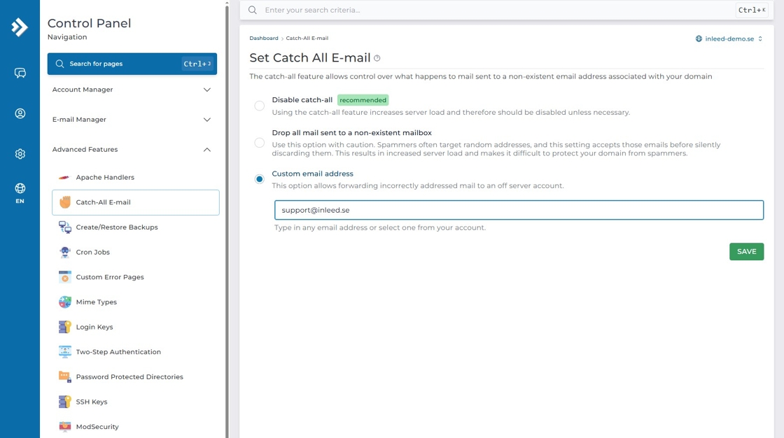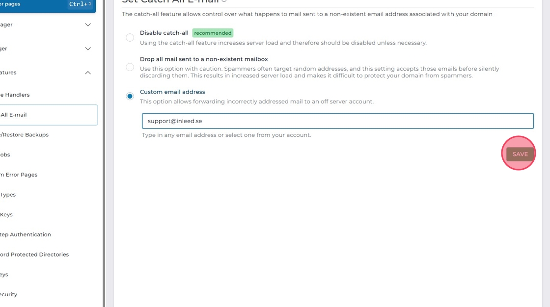 Custom email address: Här ställer du in vilken mail som ska fånga upp mailadresser som antingen inte existerar eller är felstavade.
