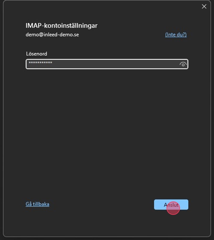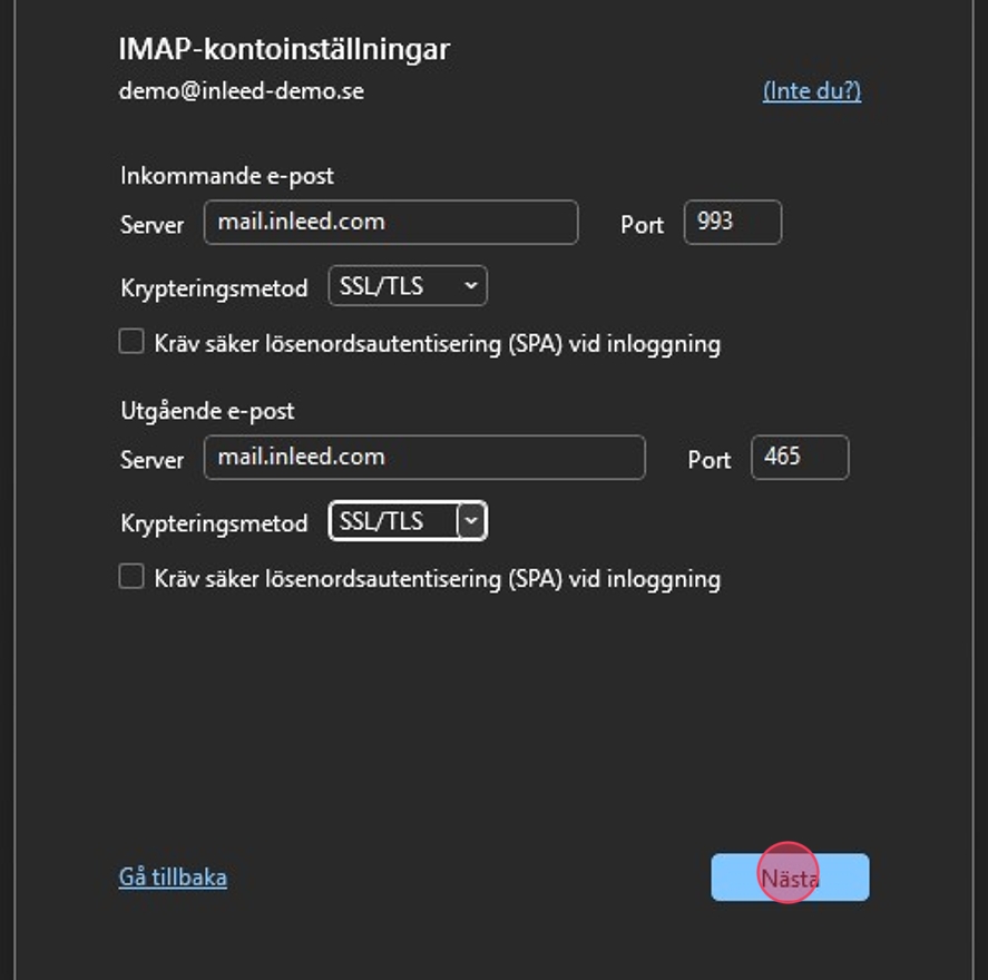4Fyll i informationen som efterfrågas:Server för inkommande mail: mail.inleed.com