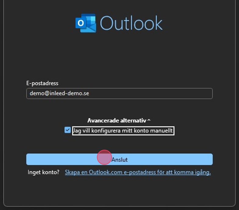 Kryssa i: "Jag vill konfigurera mitt konto manuellt".