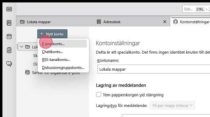 Klicka på "Nytt konto" och välj sedan "E-postkonton".