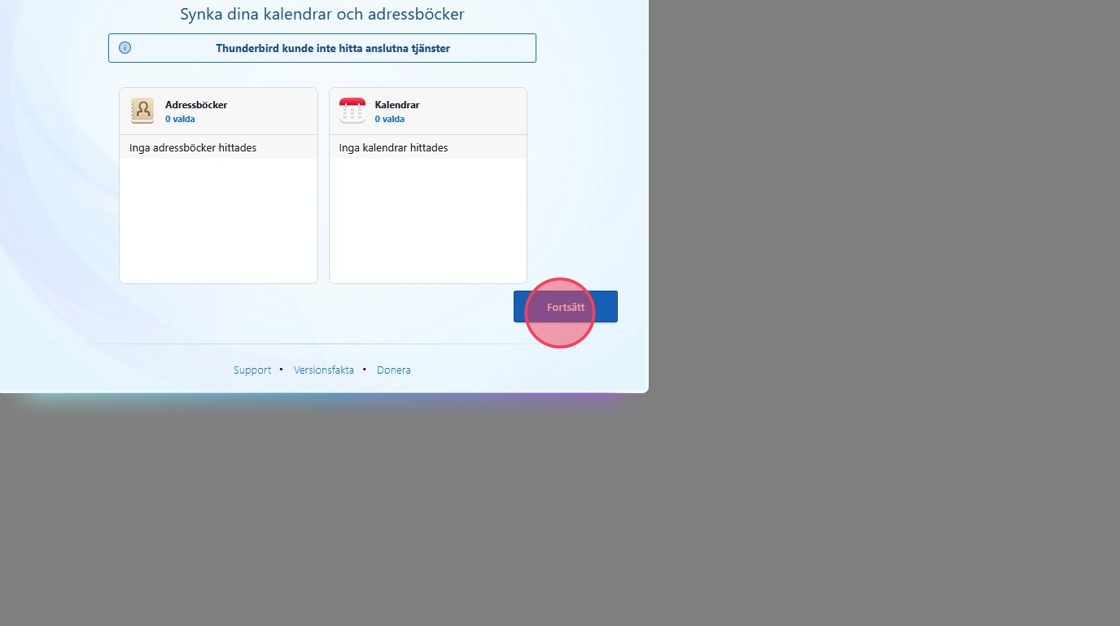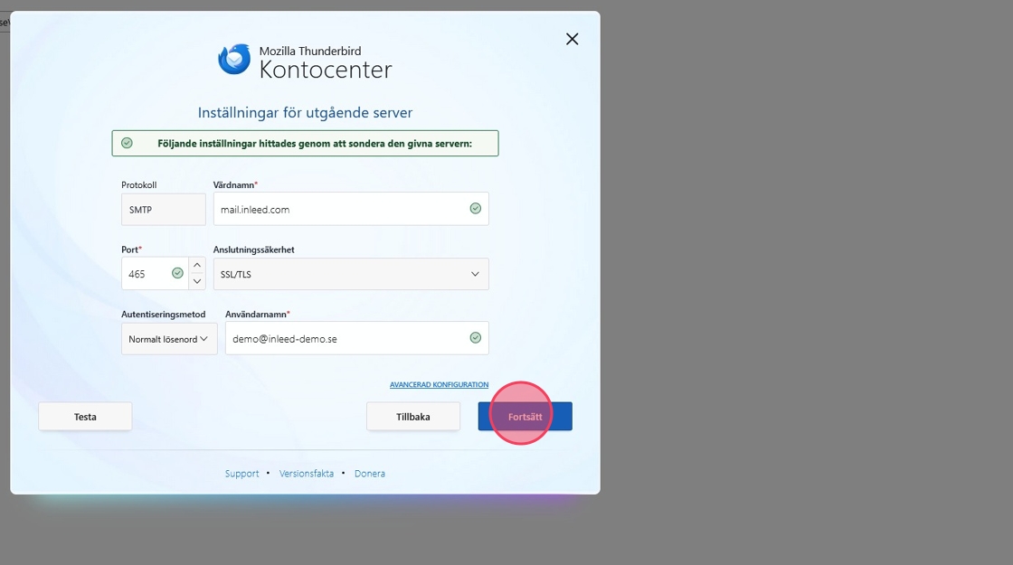 Om testet lyckas, klicka på "Fortsätt". Om det inte fungerar, kontrollera att alla uppgifter är korrekt ifyllda för både inkommande och utgående e-post.