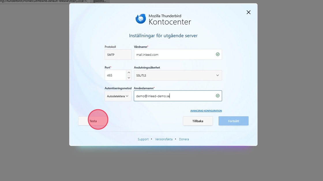 Fyll i inställningar för utgående e-post (SMTP): - Värdnamn: mail.inleed.com