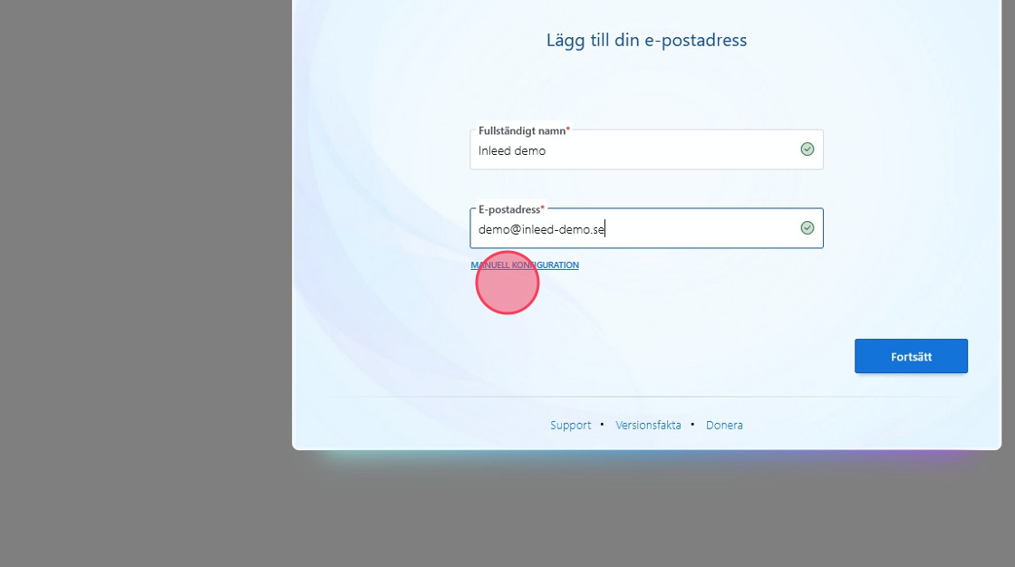 Fyll i ditt namn under "Fullständigt namn" och ange den e-postadress du vill lägga till under "E-postadress". Klicka därefter på "Manuell konfiguration".