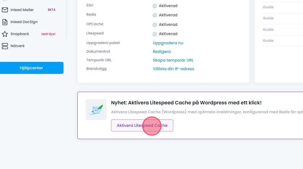 3Scrolla längst ner på sidan och klicka på "Aktivera Litespeed Cache".