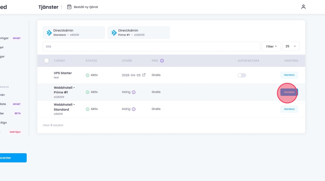 2Klicka på "Hantera" till höger om din webbhotellstjänst.