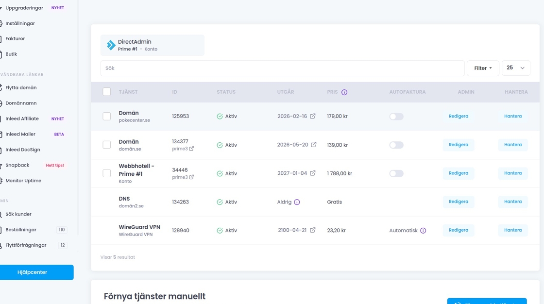 Nu är autofaktura aktiverat på domänen pokecenter.se vilket innebär att du automatiskt kommer att få fakturor 60 dagar innan tjänsten löper ut. OBS! Autofaktura är inte en automatisk förnyelse. Förnyelse av tjänsterna sker endast när fakturan betalas, annars krediteras fakturan och tjänsterna blir inte förnyade.