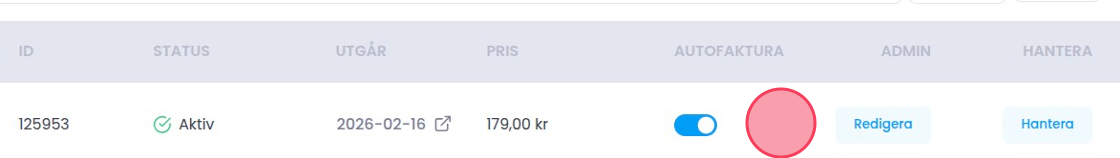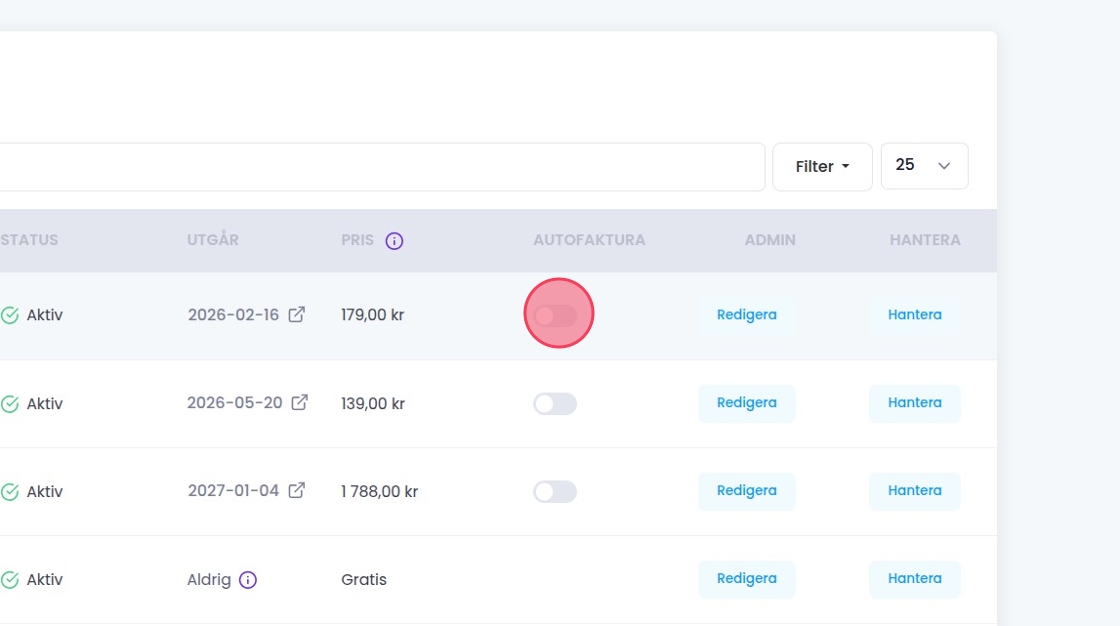 Klicka på bockrutan under kolumnen "autofaktura" för att aktivera autofaktura.