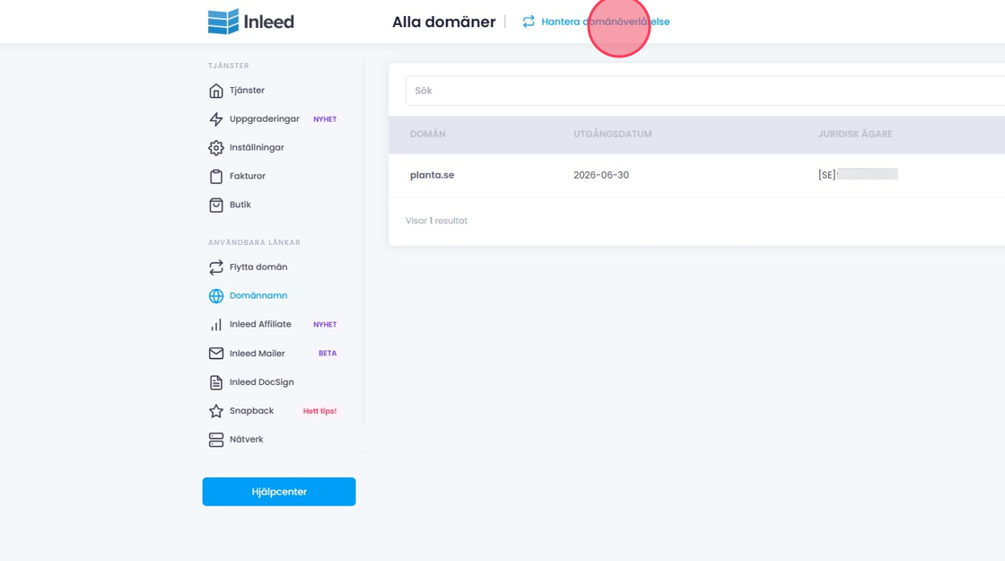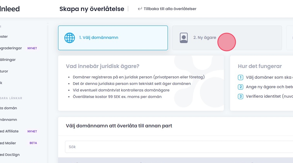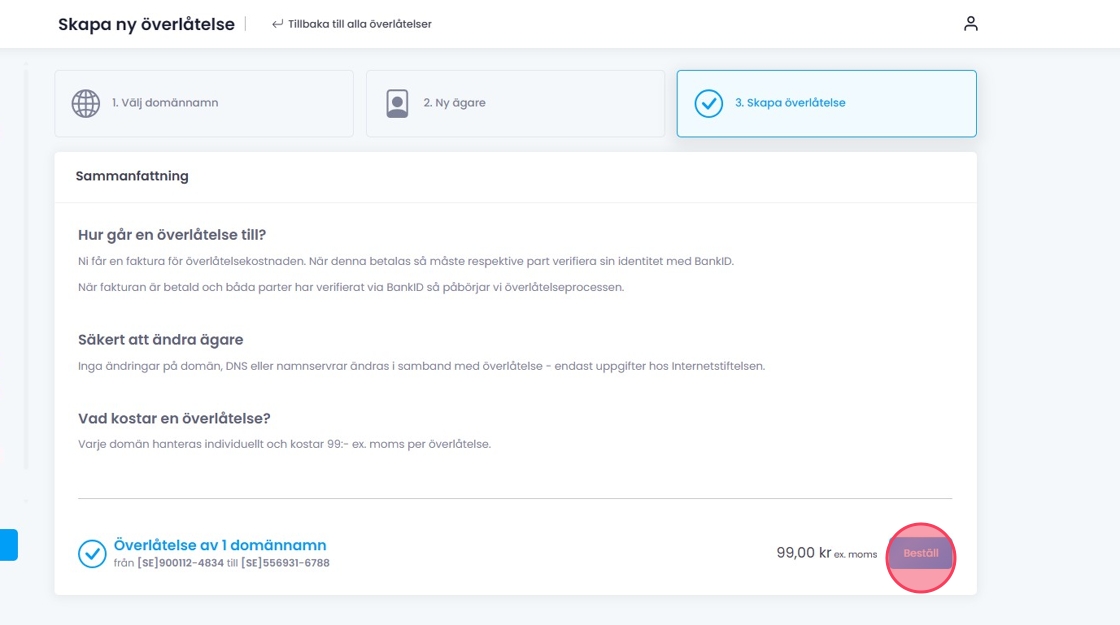 Den här guiden visar hur du genomför en överlåtelse av ett domännamn till en ny ägare via kundzonen, inklusive validering av uppgifter och betalning av överlåtelseavgift. Domänöverlåtelsen gäller för .SE och .NU domäner.