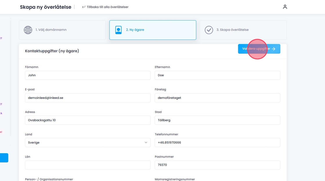 Fyll i uppgifterna för den nya ägaren och klicka på "Validera uppgifter"