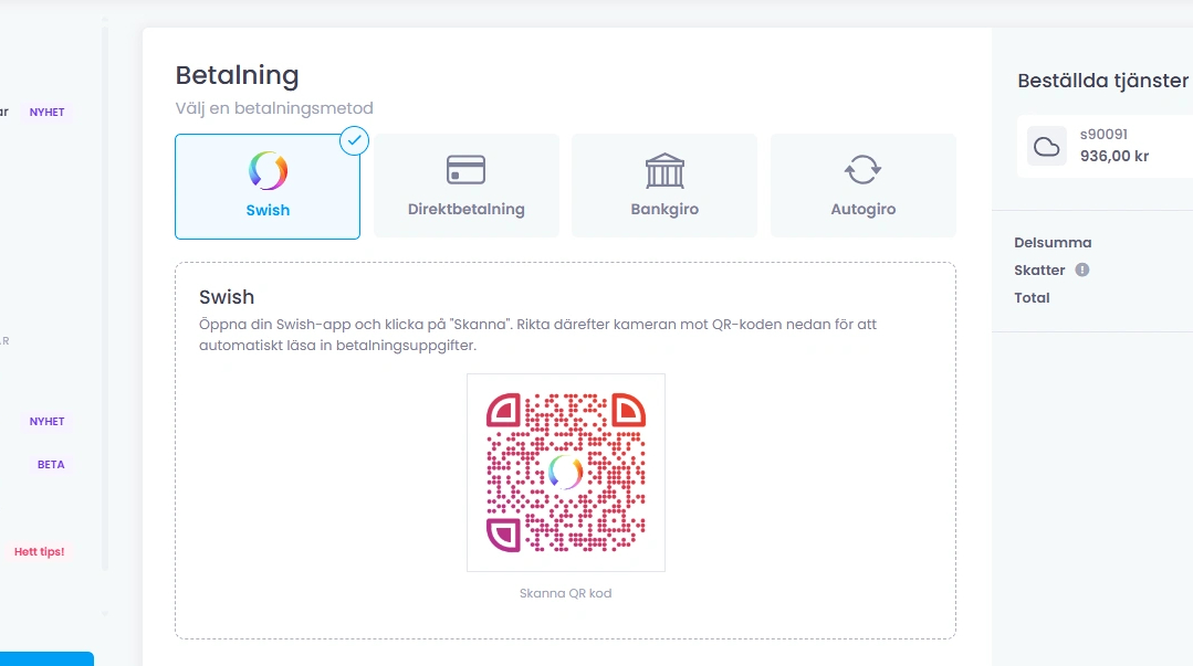 6Välj önskad betalningsmetod: Swish, kort, bankgiro eller autogiro. När betalningen är genomförd förnyas tjänsten eller tjänsterna automatiskt.