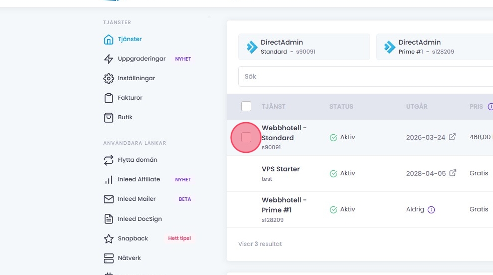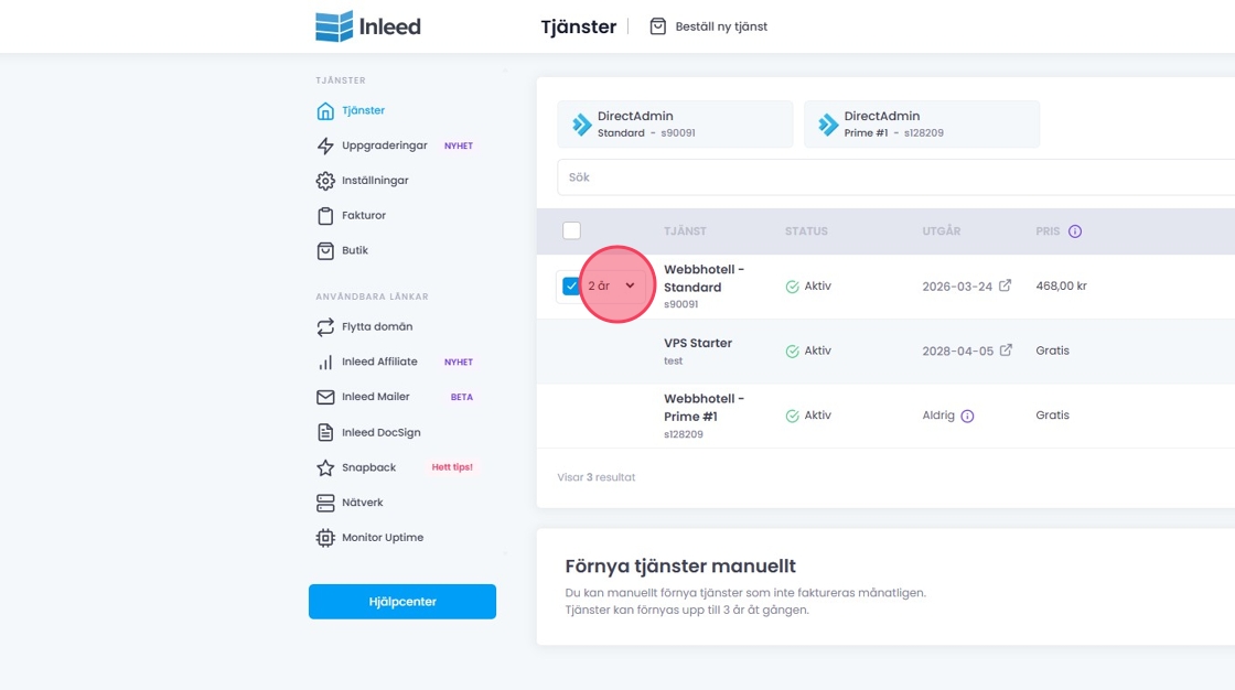 Den här guiden visar hur du förnyar en eller flera av dina tjänster hos Inleed och väljer betalningsmetod direkt i kundzonen.