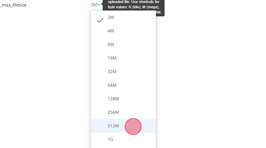 6Välj valfri storlek i listan för att ändra uppladdningsgränsen (t.ex. "512M").