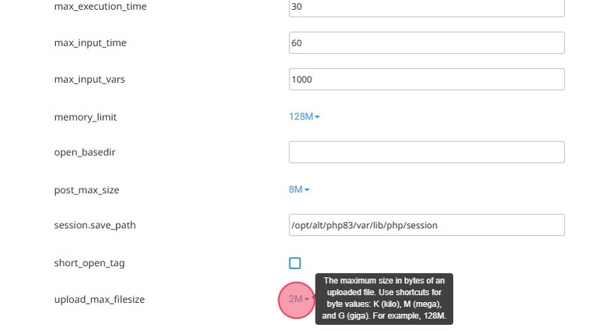 5Klicka på nuvarande värde för "upload_max_filesize" (t.ex. "2M").