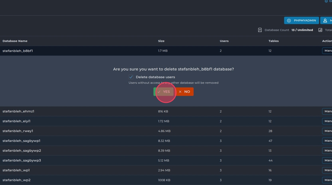 När du tar bort en databas raderas allt innehåll permanent och kan inte återställas.6Bekräfta borttagningen genom att klicka på "Yes".