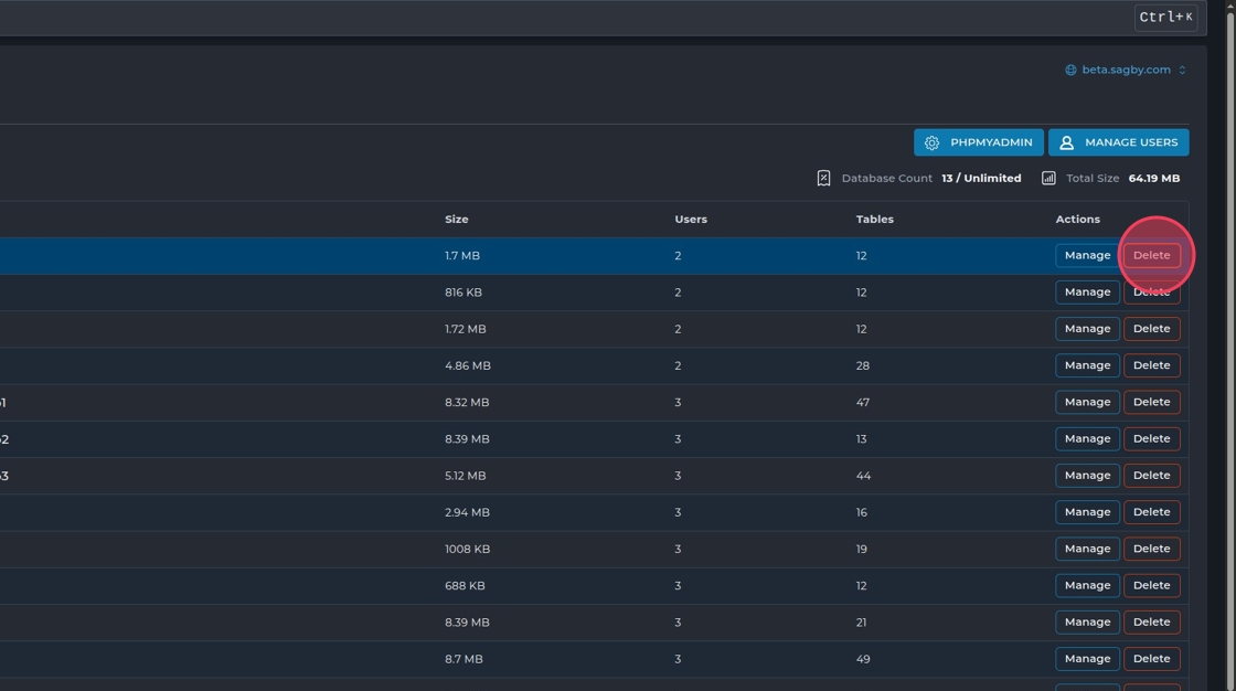 5Klicka på "Delete" vid den databas du vill ta bort.