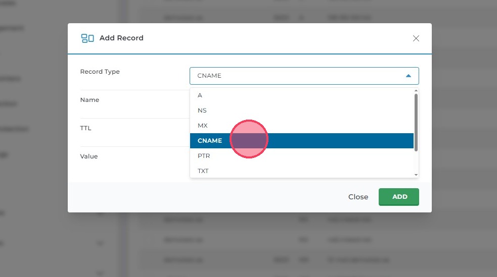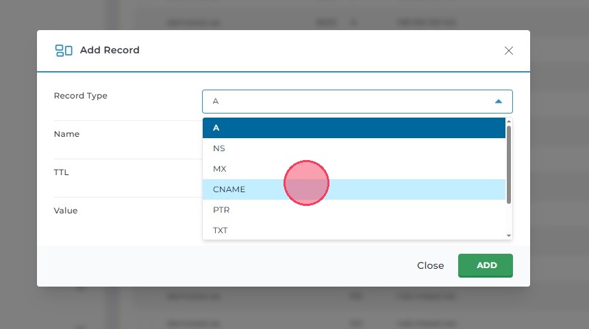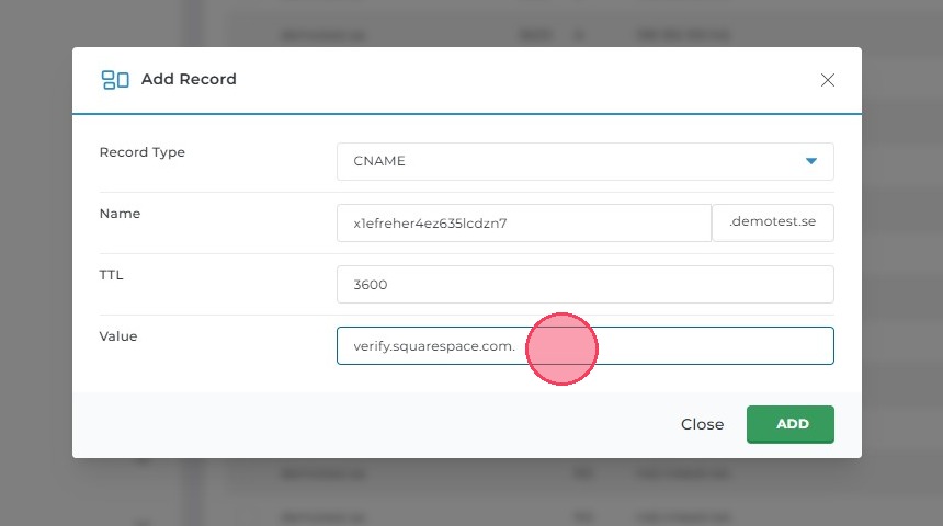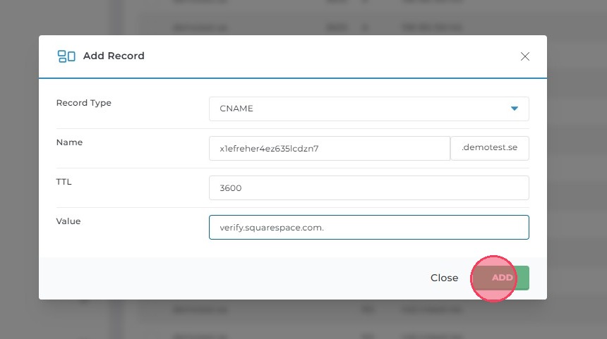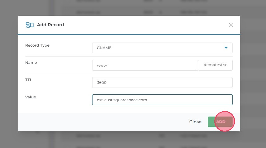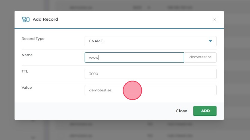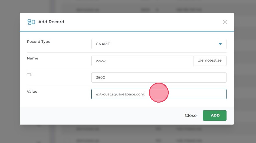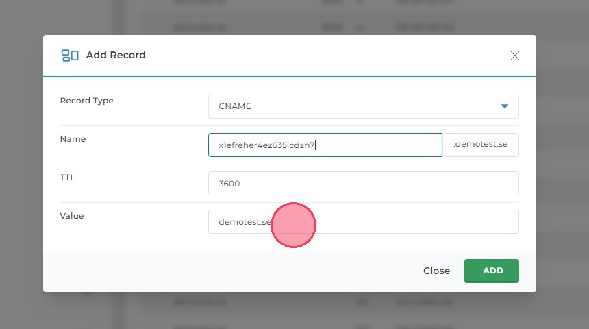 Klicka på "ADD" för att lägga till och spara CNAME-posten.