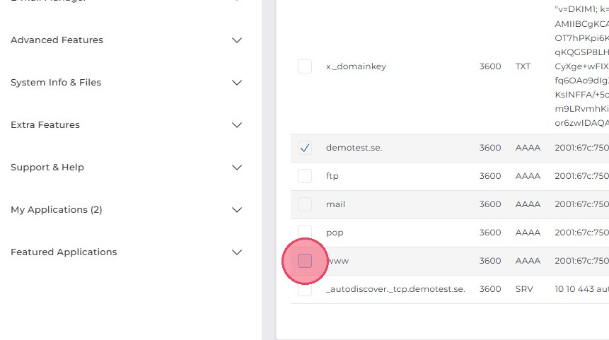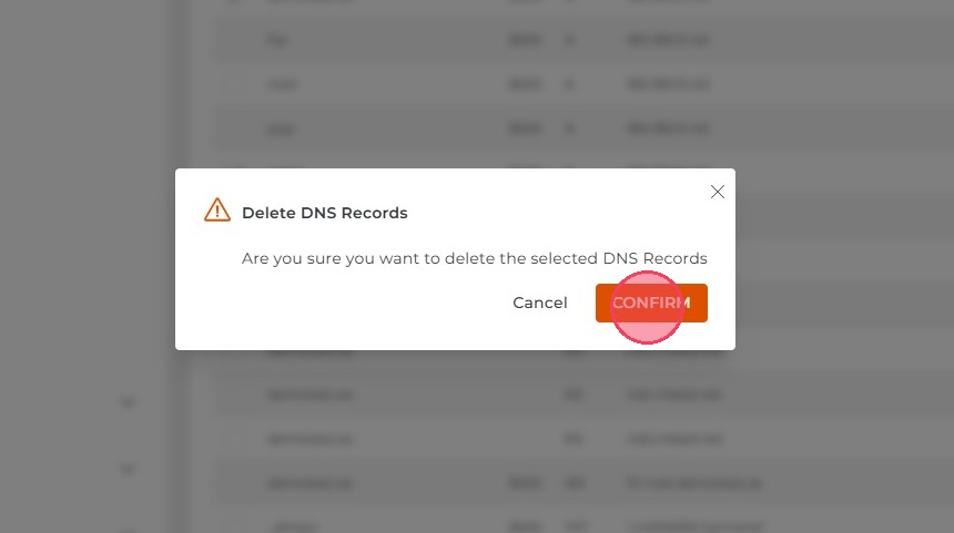 Klicka på "Delete" för att ta bort de markerade DNS-posterna.