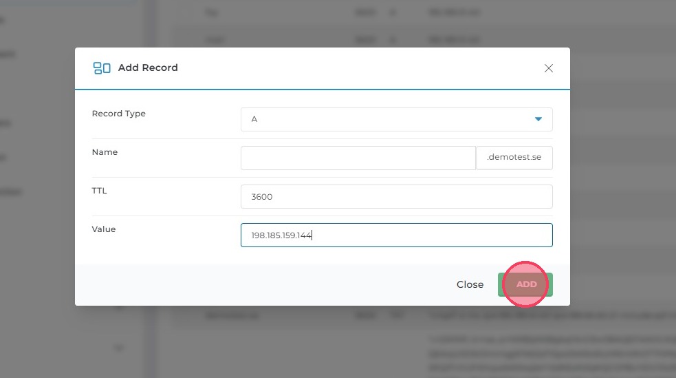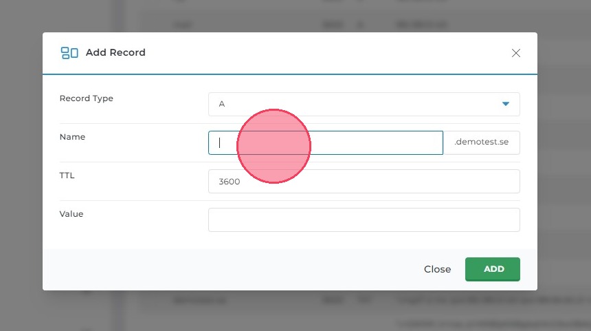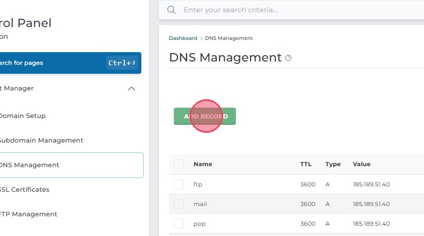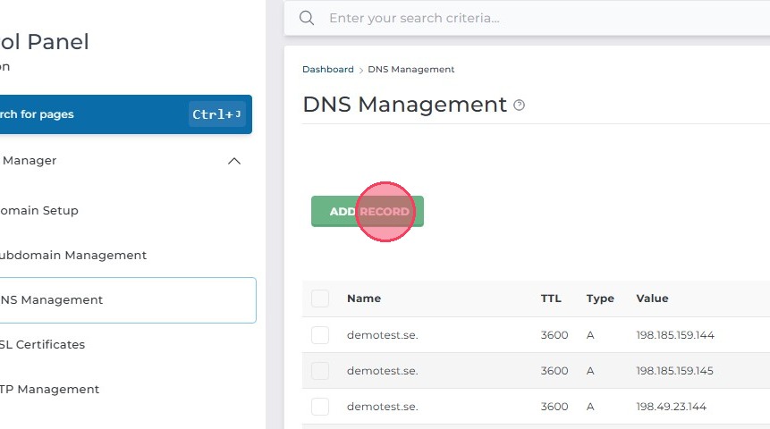 Klicka på "Add Record" för att skapa en ny DNS-post.